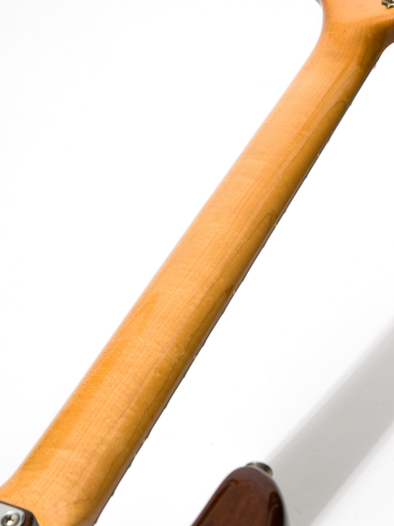 本機は指板にスキャロップ加工が施されています。スキャロップの形状は"リッチー・ブラックモアタイプ"と呼ばれる形状になっています。この"リッチーブラックモアタイプ"はその名の通りリッチー・ブラックモアが採用しているスキャロップの形状です。全体を均等に削る一般的なスキャロップとは違い、基本的に1弦側が深く、6弦側は浅めでブリッジ寄りに削り込むような形状になっています。6弦等太め弦は深く押弦してしまうとピッチがずれやすいので、6弦側が浅くなっていることで、ピッチが安定します。フレットにはジャンボフレットが使用されており、スキャロップ加工と相まって、非常に軽いタッチで運指が行なえます。また、ナットはイングヴェイ・マルムスティーンが使用していることで有名なブラスナットです。一般的な牛骨のナットに比べて摩耗に強く、サウンドもブライトです。