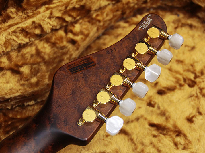 SCHECTERのフラグシップモデルEX-VB-24 CTMです。キルトメイプルトップ/1ピースアッシュバックボディー、バーズアイメイプルネックとなっていて、レギュラーラインとは違ったスペックの個体です。前オーナー様は楽器フェアなどのショーモデルとしてご購入されたそうです。ピックアップにはSCHCTERオリジナルモデルをH-S-Hでレイアウトしています。コントロールはボリューム、スプリットトーン、5ウェイピックアップスイッチ、コイルタップスイッチです。