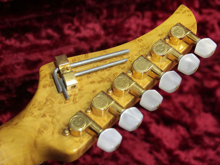 税込定価約41万円のCrews Maniac SoundのフラッグシップモデルAb's 6 Stringに、税込定価約6万9千円のBKP The Mule Gold Cover Setを搭載した個体です。仕様はキルトメイプル/コリーナボディー、ハカランダ指板、バーズアイメイプルネックです。ネックシェイプは一般的なCシェイプを基本に、ハイフレットに進むとややDシェイプに変化させることで、クラシックスタイルのフォームでも弾きやすく仕上げられています。加えて、新品時から指板サイドがスキャロップ加工されているため、握り込みやすさも抜群でシェイクハンドスタイルの方にも馴染みやすい形状です。指板Rはフラットな12"、フレットはJim Dunlop 6105(ミディアムジャンボ)ですのでVintageタイプのフレットに比べ軽いタッチで運指が可能です。