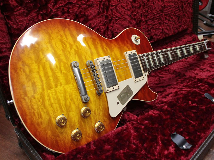 Gibson Custom Shop Hand Select Historic Collection 1959 Les Paul Standard Reissue VOSです。仕様はハンドセレクトされたキルトメイプルトップにマホガニーボディー、ローズウッド/マホガニーネックです。2014年製のHistoric Collectionですので、ヴィンテージと同様にチューブレスのトラスロッドやニカワによるネックジョイント・指板の接着が行われています。ピックアップはフロント・リア共にGibson Custom Buckerが搭載されています。スイッチプレートはGibson創立120周年記念プレートです。また、バックプレートはギブソン・カスタムのブランドの製品開発を取り仕切っているEdwin WilsonとディレクターセールスマネージャーのThom Fowleのサインが入った特別製です。