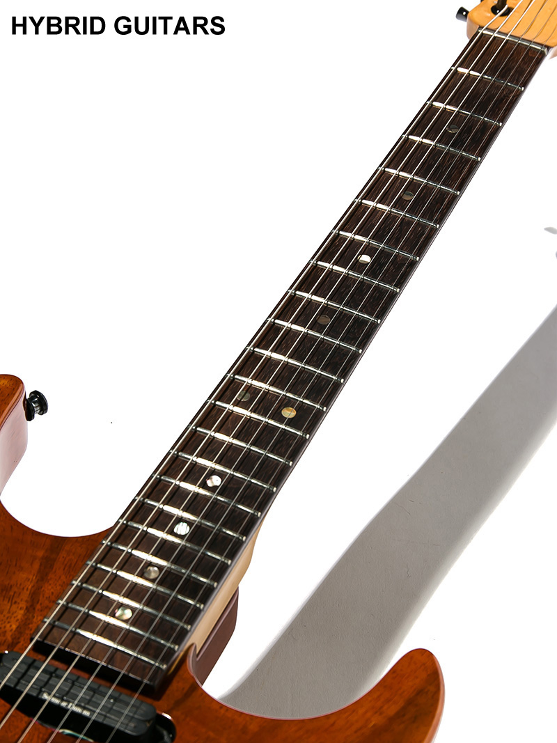 本機の仕様はフィギュアドトップ/マホガニーバックボディー、ローズウッド/バーズアイメイプルネックです。ネックシェイプはやや薄めのUシェイプで、一般的なFender 60'sタイプよりもやや両サイドに肉付きがある印象です。指板Rはハイフレット側がよりフラットになる12-16インチのコンパウンドラディアスで、フレットはJim Dunlop 6170に近くVintage Typeよりも幅広いタイプです。フロントとリアピックアップはToneのPush/Pullでコイルタップ出来ますので、3シングルのギターのようにもお使いいただけます。
