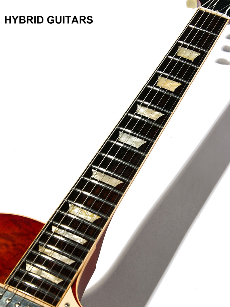 仕様はHistoric Collectionと同様で1959年当時の仕様に準じており、Figured Maple / Mahoganyボディー、Rosewood指板、Mahoganyネックです。ネックシェイプはHistoric Collection 1959 Les Paulによく見られるシェイプです。ピックアップにはGibson Burst Bucker #1 / Gibson Burst Bucker #2を搭載しています。金属パーツのスクラッチ等はありますが全体の使用感は少なく、ネックの状態も良好でトラスロッドの余裕も確認済みです。電装系の状態も良好です。