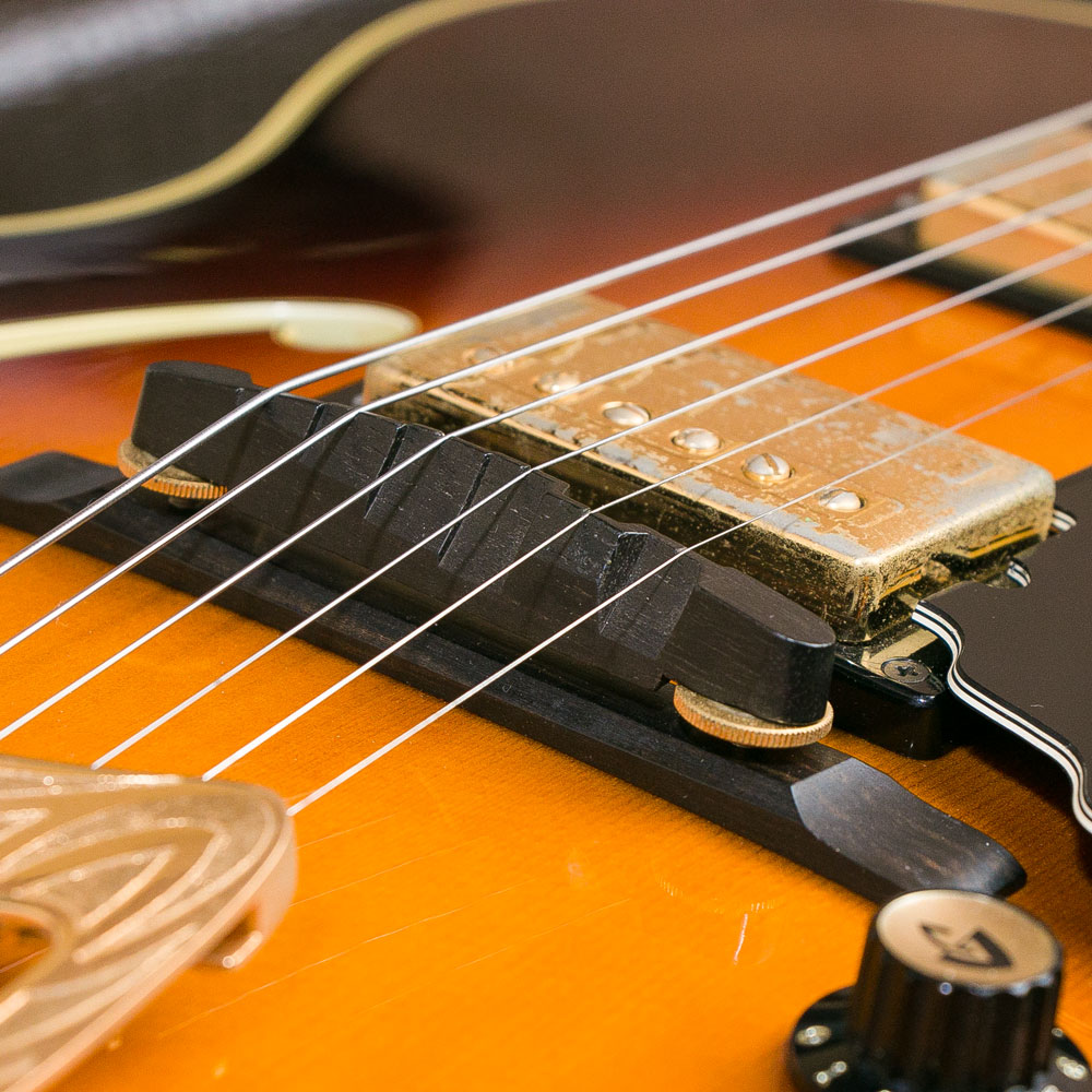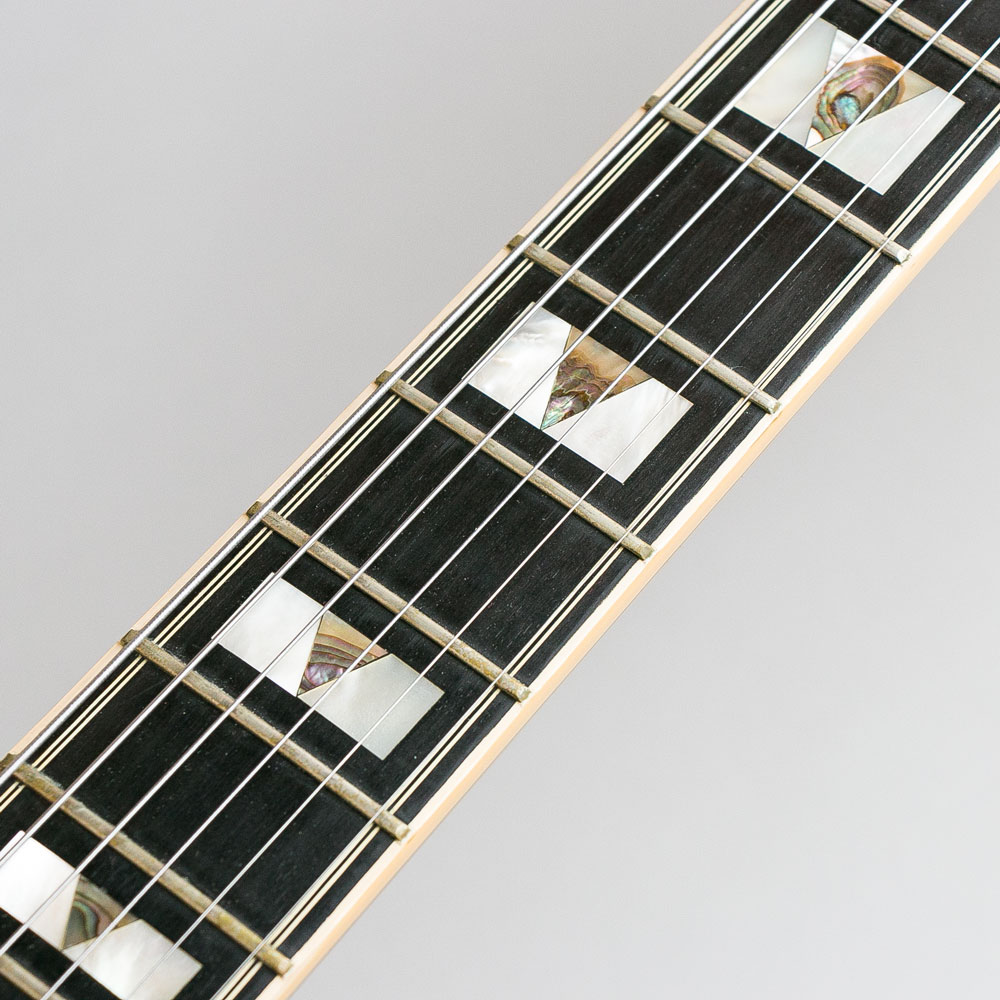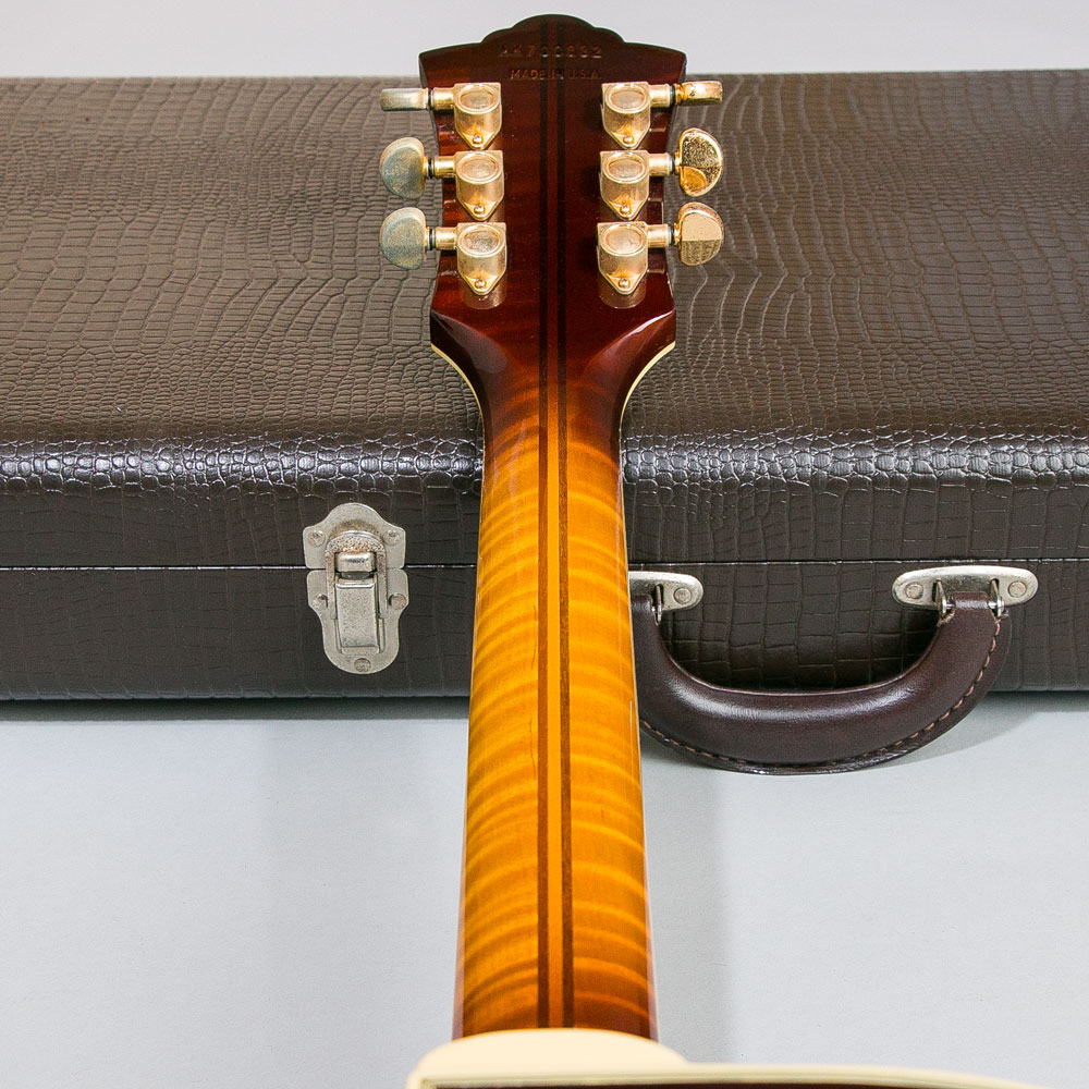 本機の仕様は単板のスプルーストップ/フレイムメイプルサイドバックボディー、エボニー指板、フレイムメイプルネックです。ボディーサイズは17インチで、ピックアップにはGUILDオリジナルのハムバッカーを搭載しています。ゴールドメッキが薄くなるなどの経年変化はありますが、製造から20年以上経過していることを考えると使用頻度は少なかったと思われ使用感は多くないコンディションです。ネックの状態も良好で、トラスロッドも順反り・逆反り方向ともに余裕を確認済みです。