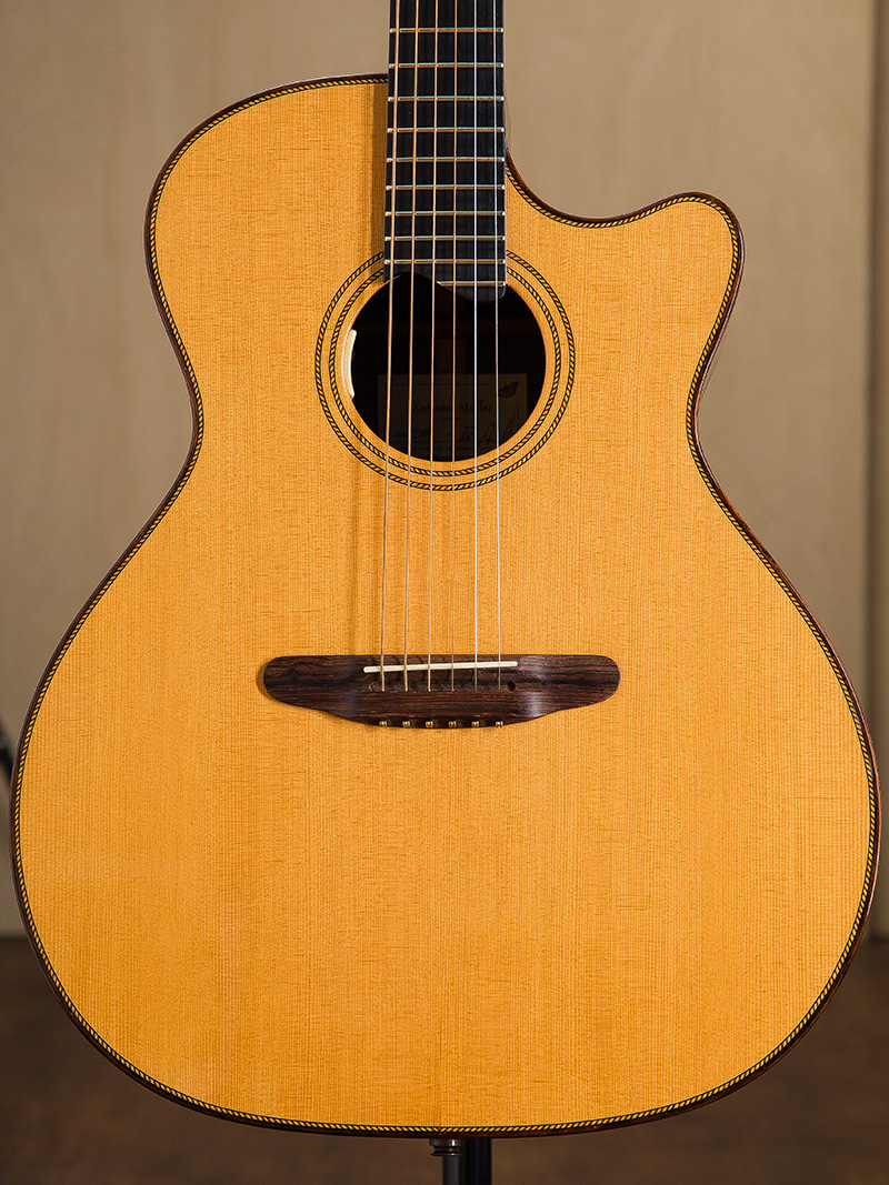 本個体は良質なBrazillian Rosewoodを使っている為、Brazillian Rosewoodにありがちな硬質でブライト、軽くなってしまうサウンドとは異なり、抜群の箱鳴りと柔らかく極太なサウンドを持ち、サウンドホールだけでなくギター全体から音が広がっているような素晴らしいサウンドを放ちます。ボディーだけで鳴るギターが多い中、ヘッドの先からボディーエンドまでが一体となり弦の響きを奏でてくれます。ネックの状態もよく、軽いタッチでもスムーズなフィンガリングが可能で、素晴らしいプレイアビリティを持った個体となります。カッタウェイがありますのでハイフレットでのプレイもストレスなく行うことができます。ピエゾピックアップを搭載していますのでライブやスタジオでもすぐに使えるギターです。