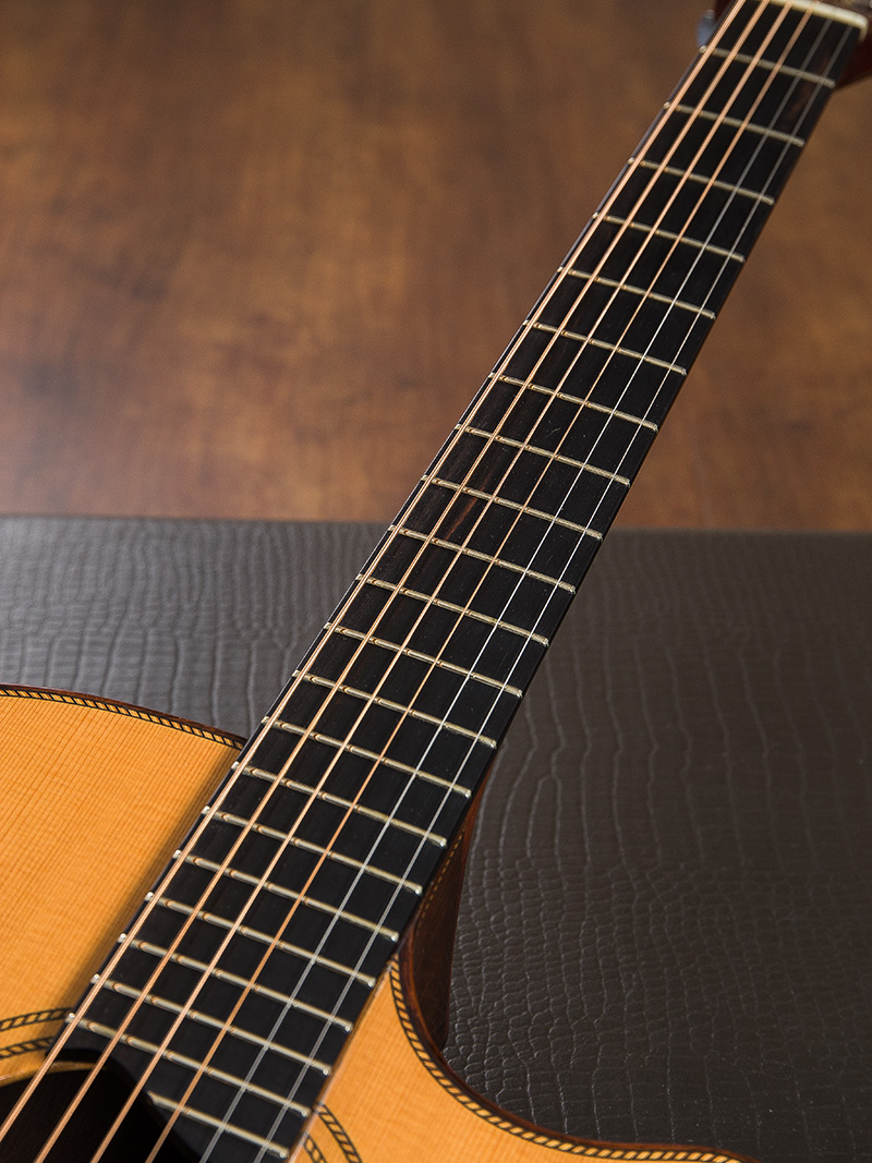 ボディートップにはSolid German Spruceを、サイドとバックにはSolid Brazillian Rosewoodが採用されています。指板はEbonyでネックにはFigured Mahogany、ヘッドトップとバック、そしてブリッジにもBrazillian Rosewoodが採用されています。