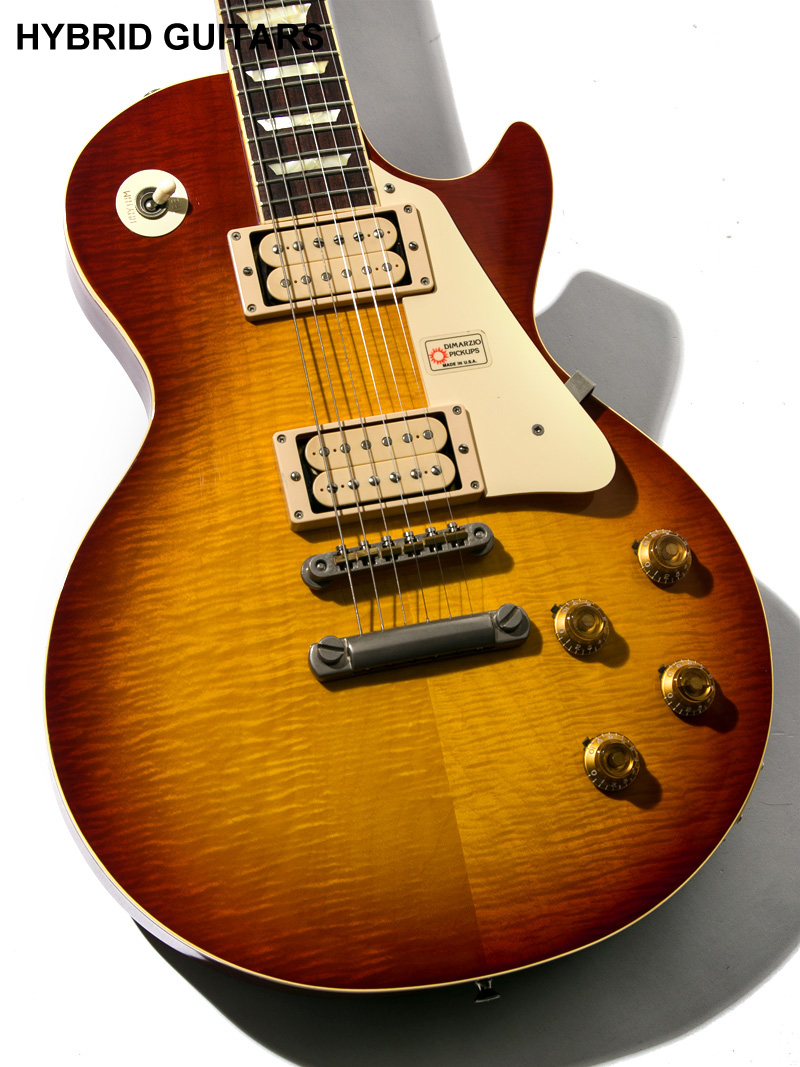 本機はボディトップにFlame Maple、ボディバックとネックにMahogany、指板にはRosewoodを使用しています。ピックアップはフロント・リア共にDimarzio PAF Set(Original)を採用しています。