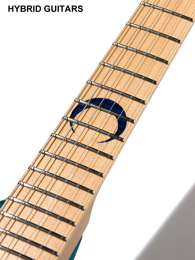 ボディートップには揺らめくブルーバーストフィニッシュのフレイムメイプルトップにボディーバックは素直なサウンドが特徴でピックアップの特性が活きやすいバウスッド材を採用、ネックにはサテンフィニッシュでサラッとした質感のネックで、反りに強い柾目のメイプルを使用しています。特別な仕様となっているカスタムモデルですが、特筆すべきはフレットの処理の素晴らしさでボールエンドと言われるフレットエッジの丸め込みが非常に丁寧かつ美しい仕上がりでフィンガリングの際に引っ掛りもなく惚れ込んでしまう職人の技術が詰め込まれています。
