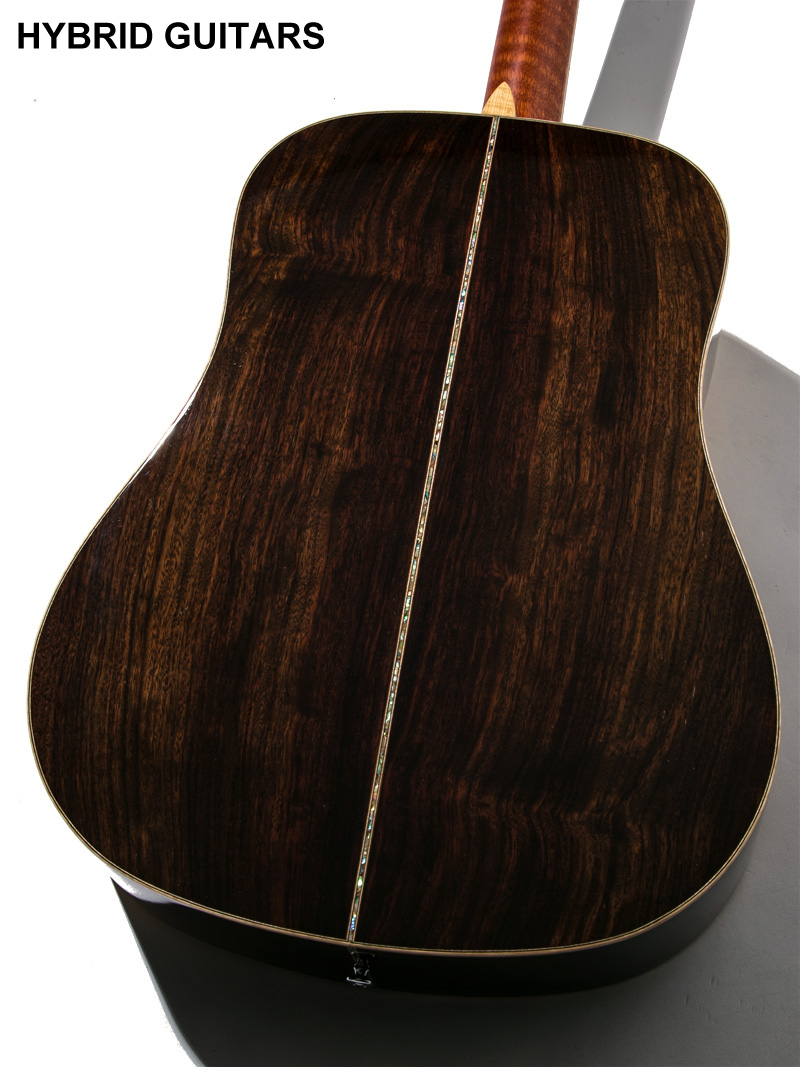 本機は14-Fret Joint Dreadnoughtスタイルを採用しています。ボディトップにSolid Adirondack Spruce 、ボディサイドとバックにSolid Indian Rosewood、指板に黒々としたEbony、ネックにはFigured Khaya Mahoganyを使用しています。ブレーシングにはQuarter-Sawn Sitka Spruceを使用したTraditional X Bracingを採用しています。