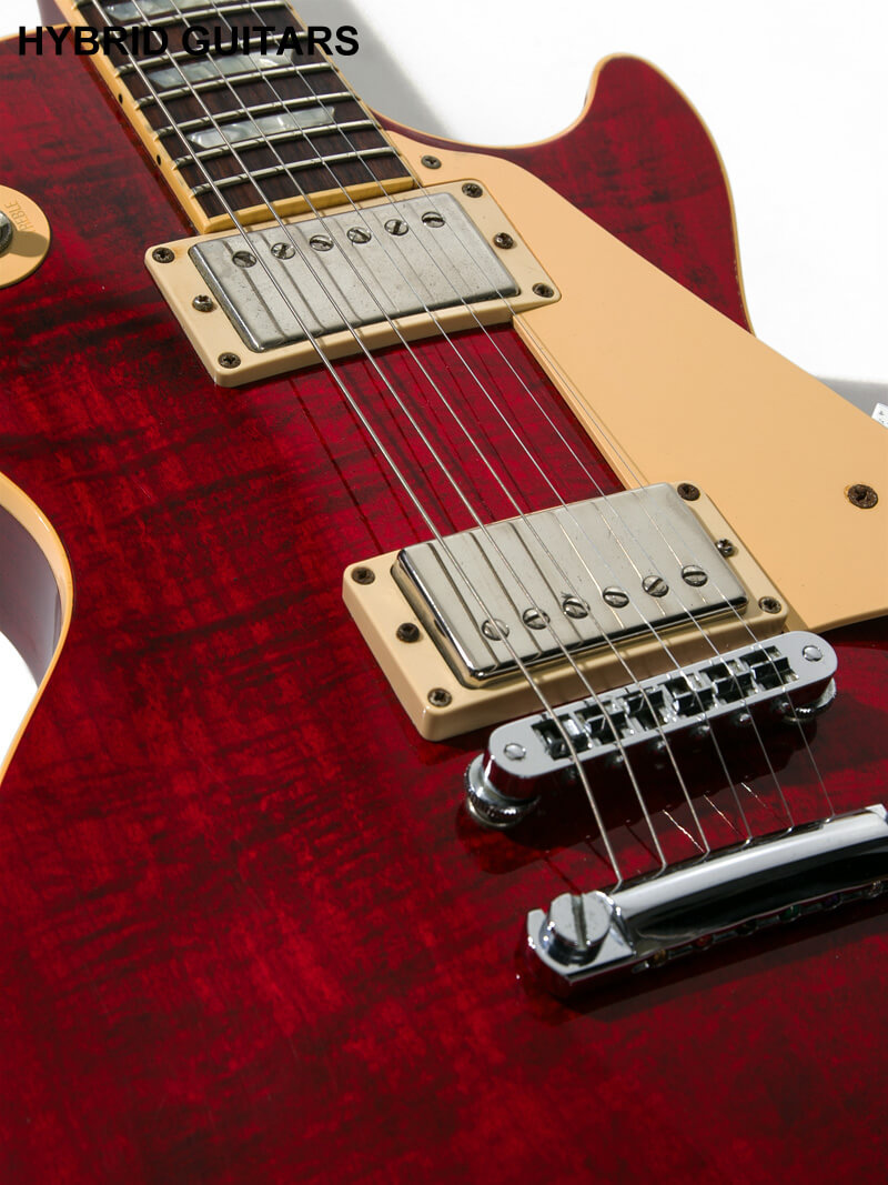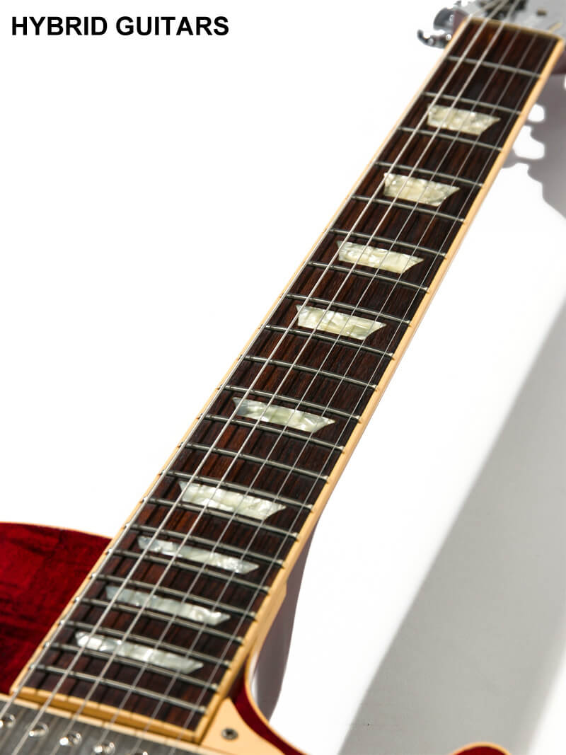 本機はボディトップにFigured Maple,ボディバックは1ピースのMahogany、12inchラディアスのRosewood指板、ネックにはMahoganyを使用しています。ネックシェイプはGibson 60'sタイプによく見られる薄めのUシェイプです。ピックアップはGibson Burstbucker 2 & 3が搭載されています。