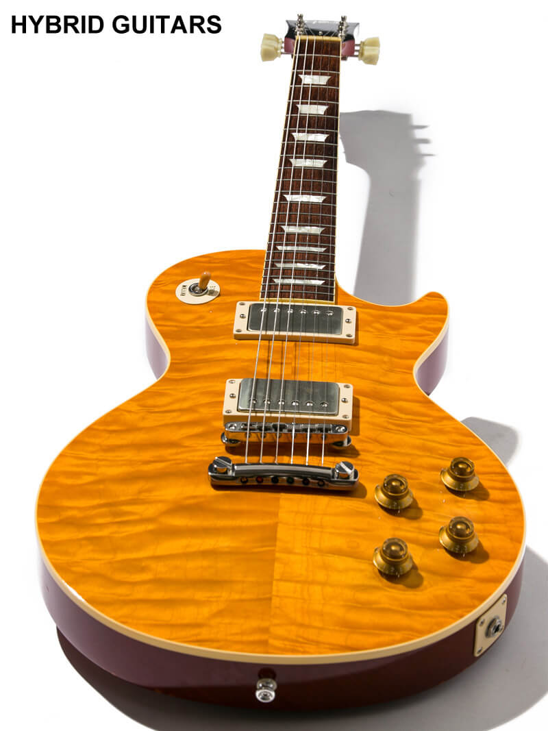 本機はボディトップにブックマッチの4A Quilt Maple、ボディバックに1ピースのHonduras Mahogany、指板にはBrazilian Rosewood、ネックにMahoganyを使用し12inchの指板ラディアスを採用しています。ヴィンテージ同様Long Tennon Jointで、コンデンサーにはOiled Paper Cap Vitamin-Q、ポットにはCTS 500KΩを採用しています。