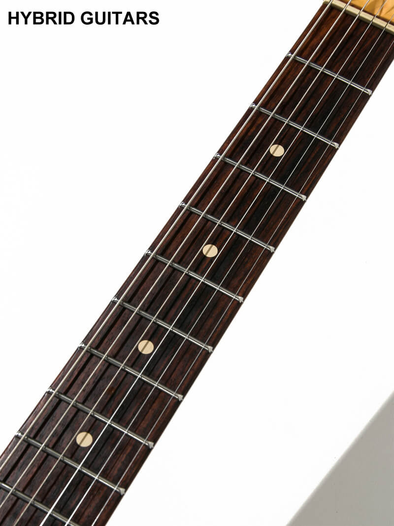 本機はボディにSwamp Ash、ネックにMaple、指板はRosewoodを使用し16inchの指板ラディアスを採用しています。ネックシェイプはEven-Taperシェイプで、Fender 60’sでよく使用される一般的なCシェイプに近い形状です。ネックジョイントにはStratocasterなどで採用している一般的なデタッチャブルではなくTom Anderson独自の二点ジョイントA Wedgieです。このジョイント方法はジョイント部を台形に削り出すことで接地面積が増え、振動伝達率向上に大きく貢献しています。また、A Wedgieは一般的なデタッチャブル加工より高度な技術が求められる加工方法です。