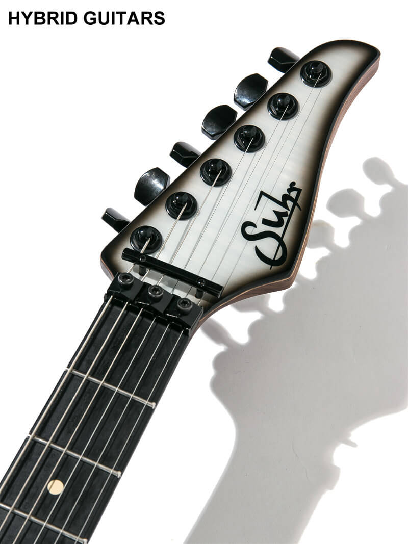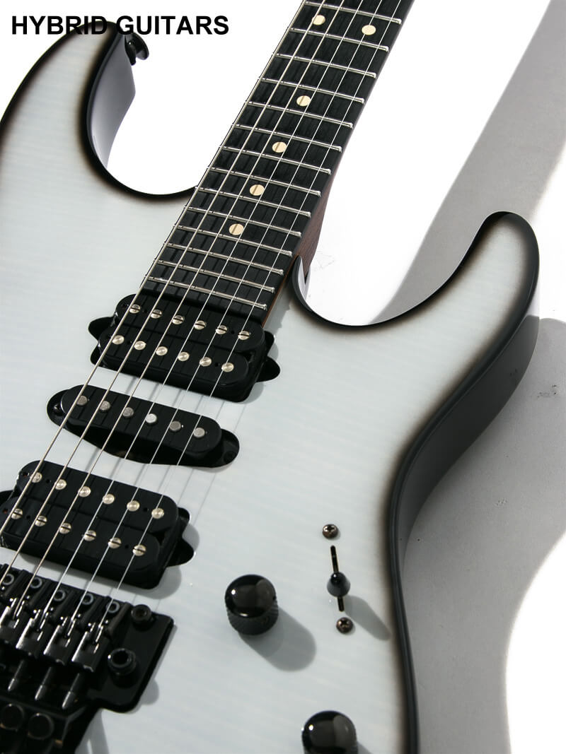 本機はボディートップにFlame Maple、ボディバックにSwamp Ash、指板にEbonyネックにPau Ferroを使用しています。ネックシェイプはModern Elliptical .800-.850を採用しており、やや薄めのDシェイプの様な形状です。指板Rには10-14インチのコンパウンドラディアスを採用しており、ハイフレットに進むにつれラディアスがフラットになって行くので、ローフレット側ではコード弾きなどの握り込みが行いやすく、ハイフレット側では速弾きやチョーキング等のフィンガリングしやすくなっています。