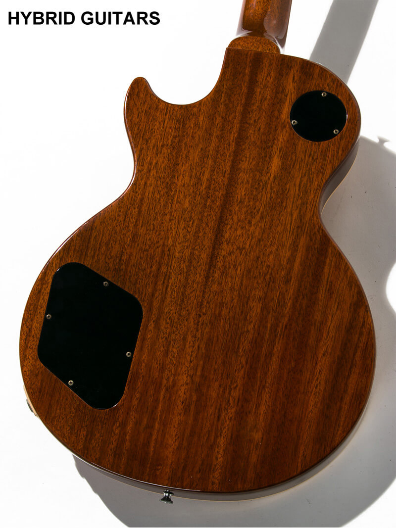 本機はボディトップに揺らめくFigured Maple、ボディバックとネックにMahogany、指板にはRosewoodを使用しています。ネックジョイントにはディープジョイントを採用しています。ピックアップにはGibson P.A.F. Setを搭載しています。フロントが7.9kΩ、リアが8.2kΩとなっており抵抗値と時期を考慮するとBurst Buckerと思われます。両ピックアップ共P.A.Fデカール付きです。