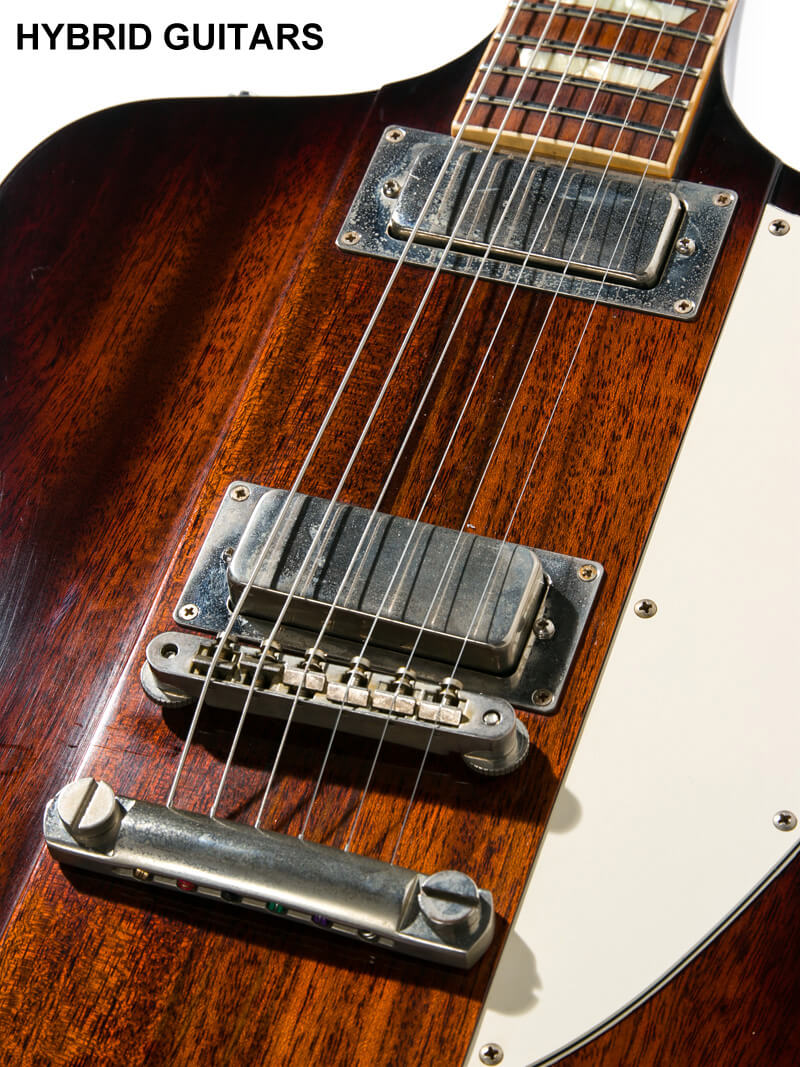 本機はFirebird Vの仕様を基本としながらもストップテイルピースを採用したモデルです。通常のヴァイブローラーがあるモデルに比べてチューニングが安定し、音にハリが出てサスティーンも伸びるのでより実用的なモデルです。