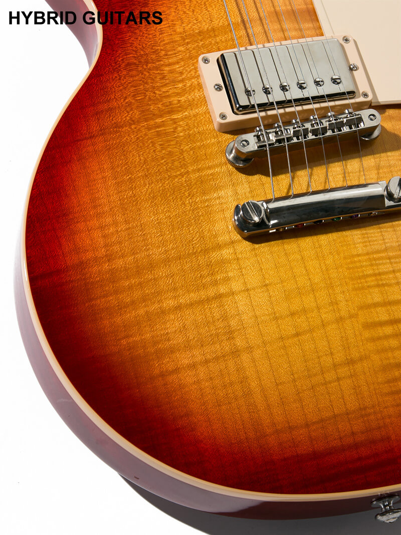 本機はボディトップにAA Figured Maple,ボディバックとネックにはMahogany、12inchラディアスのRosewood指板を採用しています。ピックアップはGibson P.A.FタイプのBurstbucker1 & 2、コンデンサーはオレンジドロップが搭載されています。